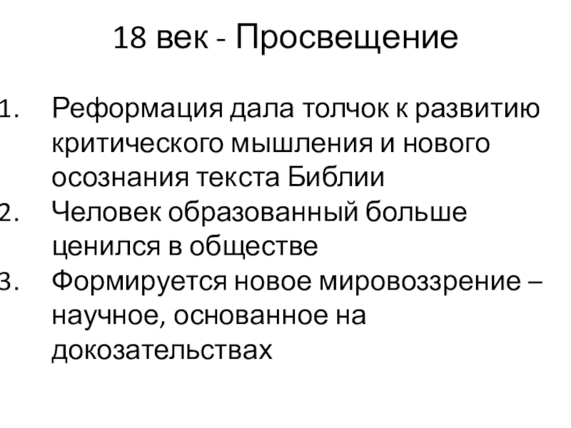 18 век - ПросвещениеРеформация дала толчок к развитию критического мышления и нового осознания текста БиблииЧеловек образованный больше