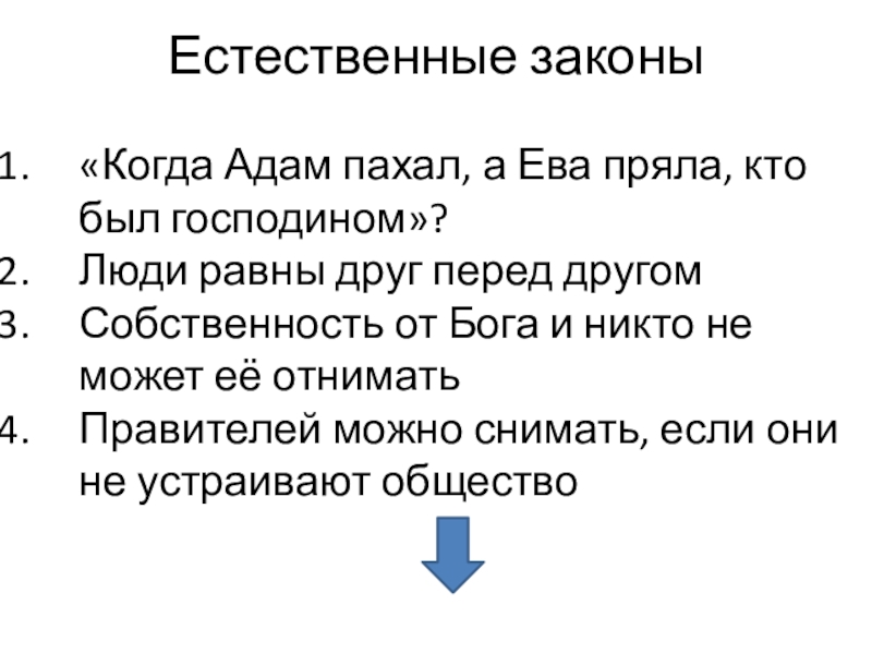Естественные законы«Когда Адам пахал, а Ева пряла, кто был господином»?Люди равны друг перед другомСобственность от Бога и