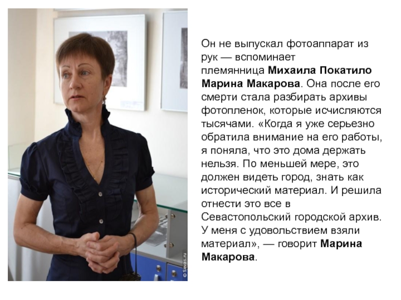 Макарова. Она после его смерти стала разбирать архивы фотопленок, которые исчисляются тысячами. «Когда я уже серьезно обратила внимание на его работы, я поняла, что это дома держать нельзя. По меньшей мере, это должен видеть город, знать как исторический материал. И решила отнести это все в Севастопольский городской архив. У меня с удовольствием взяли материал», — говорит Марина Макарова.
