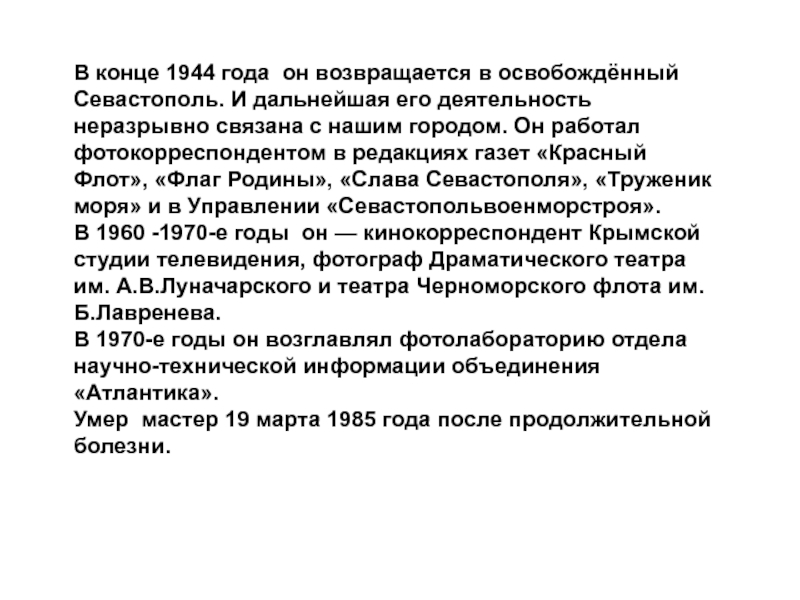 Слайд 3В конце 1944 года он возвращается в освобождённый Севастополь. И дальнейшая