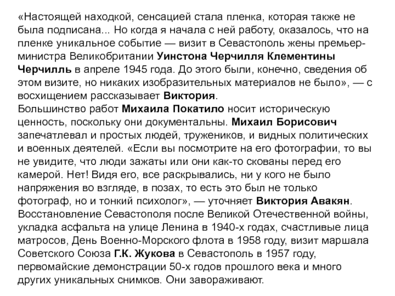 когда я начала с ней работу, оказалось, что на пленке уникальное событие — визит в Севастополь жены премьер-министра Великобритании Уинстона Черчилля Клементины Черчилль в апреле 1945 года. До этого были, конечно, сведения об этом визите, но никаких изобразительных материалов не было», — с восхищением рассказывает Виктория.