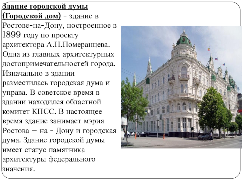 1899 году по проекту архитектора А.Н.Померанцева. Одна из главных архитектурных достопримечательностей города. Изначально в здании разместилась городская дума и управа. В советское время в здании находился областной комитет КПСС. В настоящее время здание занимает мэрия Ростова – на - Дону и городская дума. Здание городской думы имеет статус памятника архитектуры федерального значения.