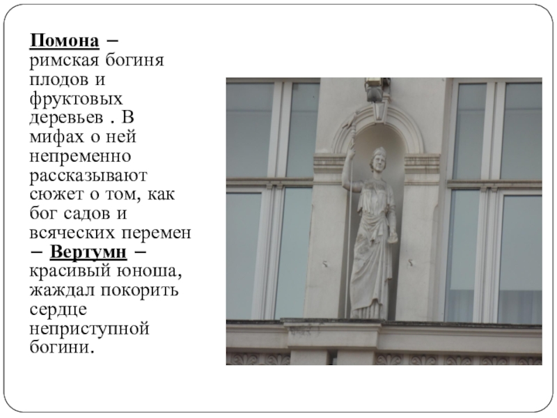 о ней непременно рассказывают сюжет о том, как бог садов и всяческих перемен – Вертумн – красивый юноша, жаждал покорить сердце неприступной богини.