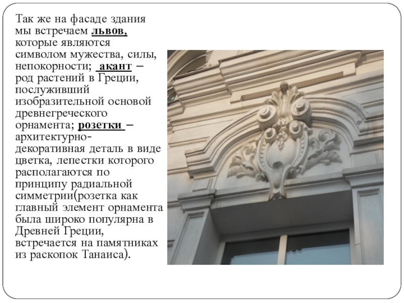 Слайд 12Так же на фасаде здания мы встречаем львов, которые являются символом