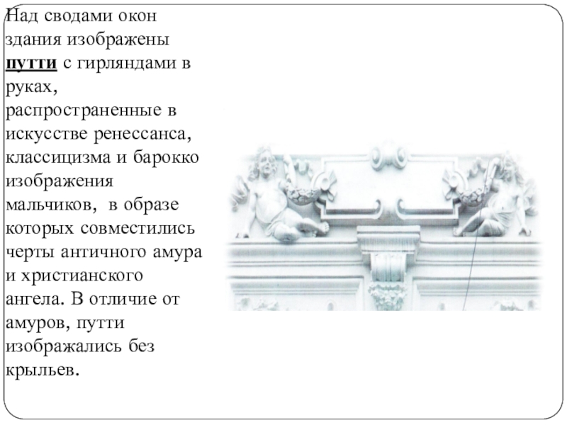 Слайд 11Над сводами окон здания изображены путти с гирляндами в руках, распространенные