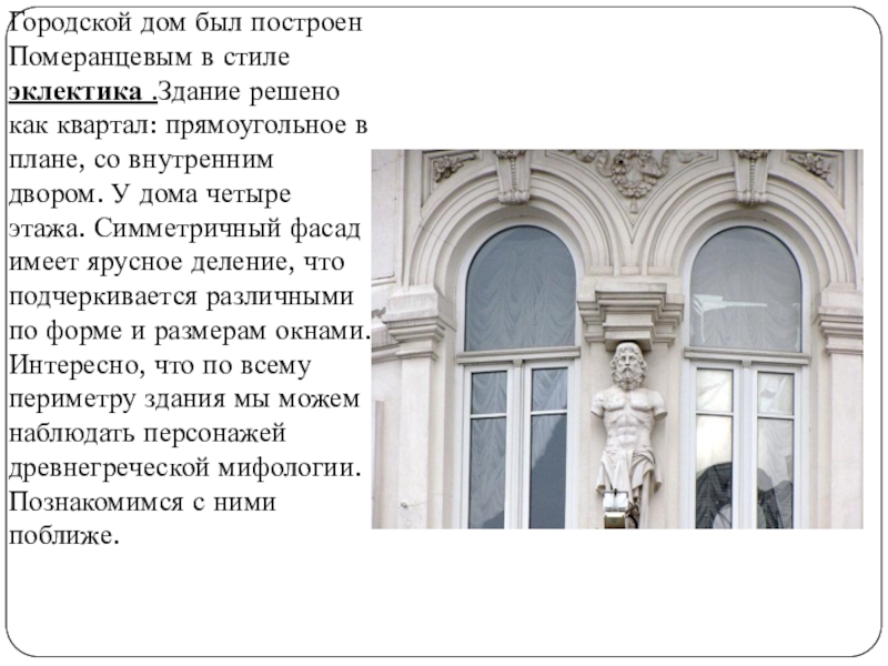 Слайд 5Городской дом был построен Померанцевым в стиле эклектика .Здание решено как