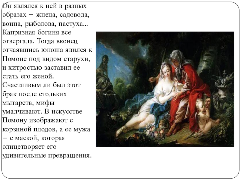 рыболова, пастуха… Капризная богиня все отвергала. Тогда вконец отчаявшись юноша явился к Помоне под видом старухи, и хитростью заставил ее стать его женой. Счастливым ли был этот брак после стольких мытарств, мифы умалчивают. В искусстве Помону изображают с корзиной плодов, а ее мужа – с маской, которая олицетворяет его удивительные превращения.