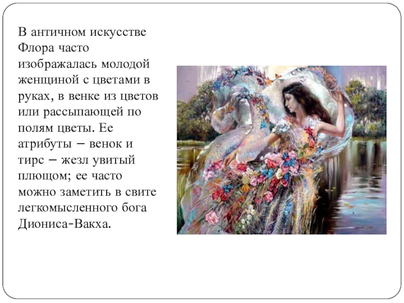 Слайд 10В античном искусстве Флора часто изображалась молодой женщиной с цветами в