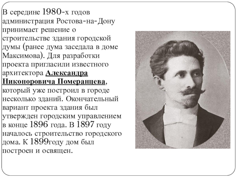 городской думы (ранее дума заседала в доме Максимова). Для разработки проекта пригласили известного архитектора Александра Никоноровича Померанцева, который уже построил в городе несколько зданий. Окончательный вариант проекта здания был утвержден городским управлением в конце 1896 года. В 1897 году началось строительство городского дома. К 1899году дом был построен и освящен.