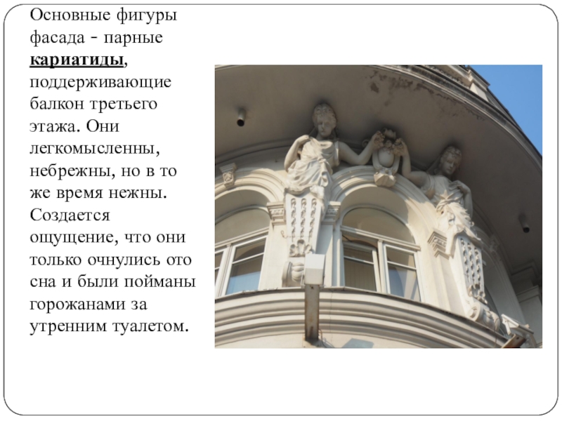 Слайд 6Основные фигуры фасада - парные кариатиды, поддерживающие балкон третьего этажа. Они