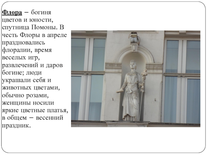 Слайд 9Флора – богиня цветов и юности, спутница Помоны. В честь Флоры