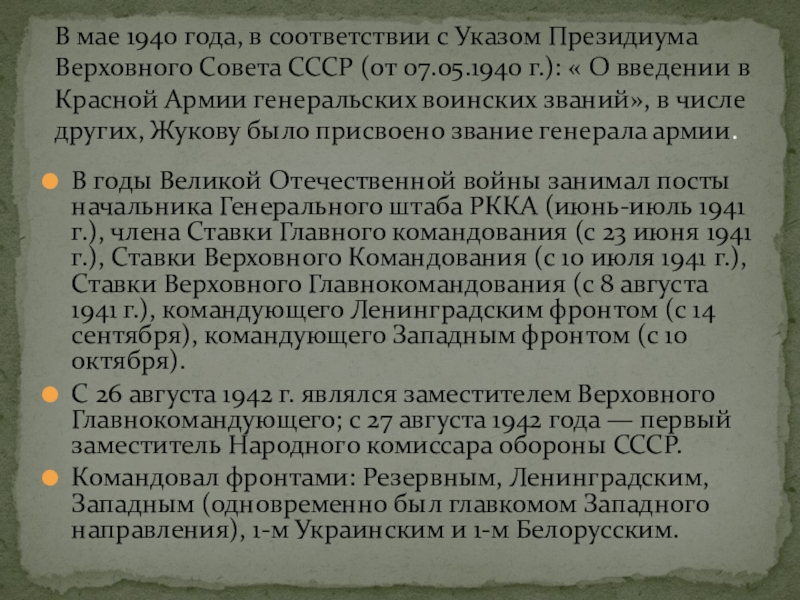 В мае 1940 года, в соответствии с Указом Президиума Верховного Совета СССР (от 07.05.1940 г.): « О введении в Красной Армии генеральских воинских званий», в числе других, Жукову было присвоено звание генерала армии.