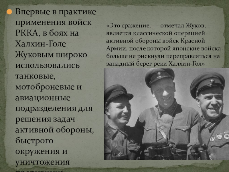 «Это сражение, — отмечал Жуков, — является классической операцией активной обороны войск Красной Армии, после которой японские войска больше не рискнули переправляться на западный берег реки Халхин-Гол»