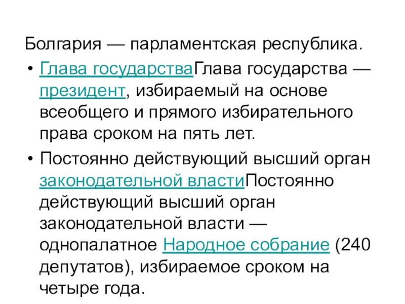 Болгария — парламентская республика. Глава государстваГлава государства — президент, избираемый на основе всеобщего и прямого избирательного права сроком на