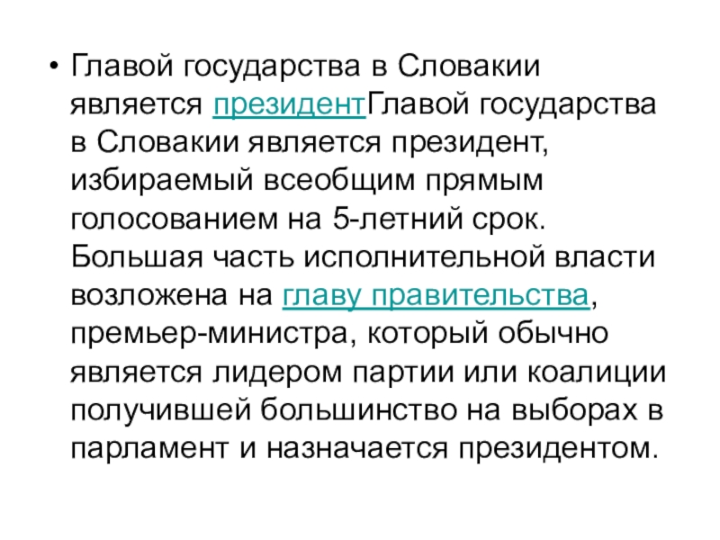 Главой государства в Словакии является президентГлавой государства в Словакии является президент, избираемый всеобщим прямым голосованием на 5-летний срок. Большая часть исполнительной власти возложена на главу правительства, премьер-министра, который обычно является лидером партии или коалиции получившей большинство