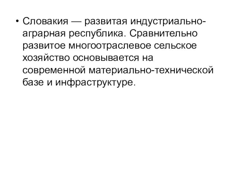 Словакия — развитая индустриально-аграрная республика. Сравнительно развитое многоотраслевое сельское хозяйство основывается на современной материально-технической базе и инфраструктуре.