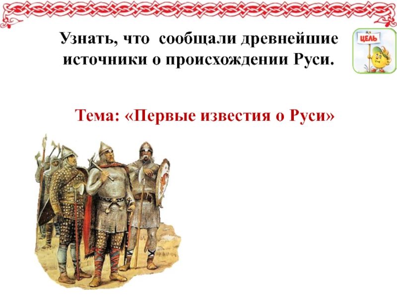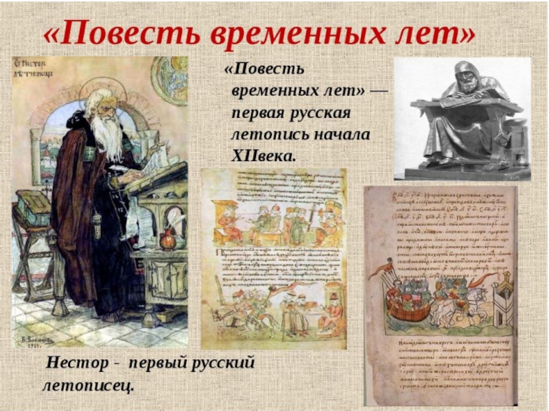 «В год 6370 (862). Изгнали [чудь, словене, меря] варяг за море и не дали им дани, и начали сами собой владеть. И не было средь них правля, и встал род на род, и была у них усобица, и стали воевать сами с собой. И сказали себе: «Поищем себе князя, который бы владел нами и судил по праву». И пошли за море к варягам, к руси... Сказали руси чудь, словене, кривичи и весь: «Земля наша велика и обильна, а порядка в ней нет. Приходите княжить и владеть нами». И избрались [среди варягов] трое братьев со своими родами... и пришли [к словенам], и сел старший Рюрик в Новгороде, а другой – Синеус – на Белоозере, третий – Трувор – в Изборске».