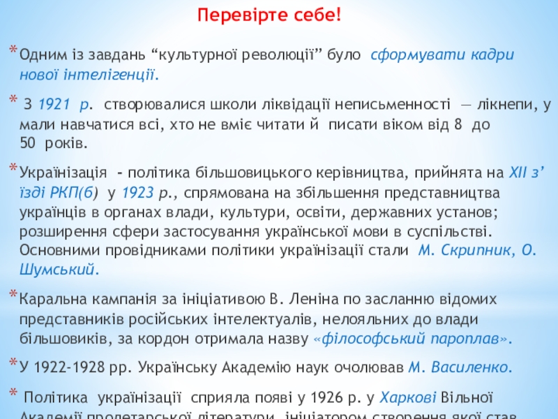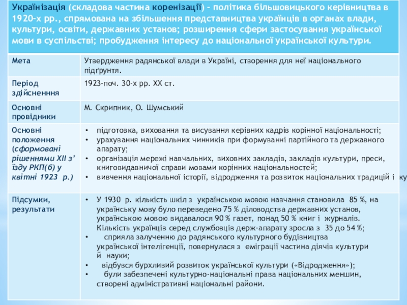 Українізація - політика більшовицького керівництва, прийнята на (Х, ХІІ, ХІІІ з’їзді РКП(б) у (1921, 1923 р), спрямована на збільшення представництва українців в органах влади, культури, освіти, державних установ; розширення сфери застосування української мови в суспільстві. Основними провідниками політики українізації стали (М. Скрипник, М. Грушевський, О.Шумський).