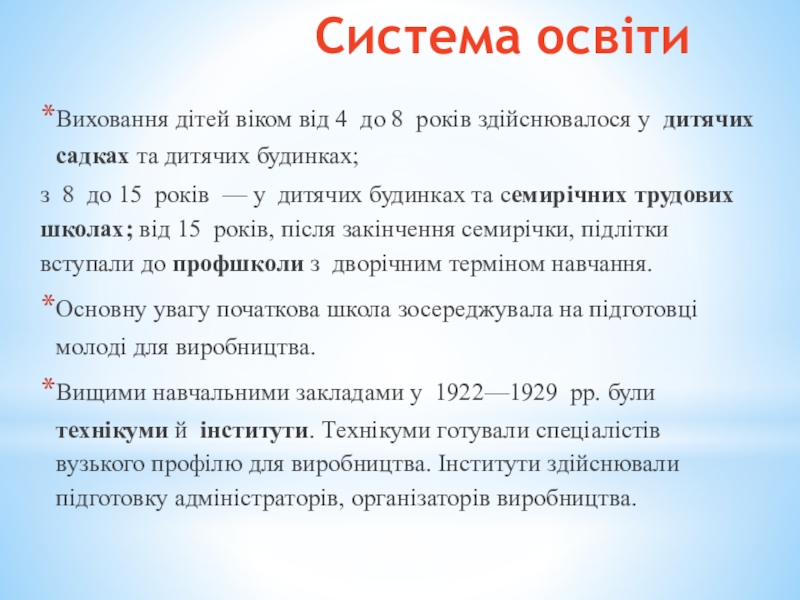 Вищими навчальними закладами у 1922—1929 рр. були технікуми й інститути. Технікуми готували спеціалістів вузького профілю для виробництва. Інститути здійснювали підготовку адміністраторів, організаторів виробництва.