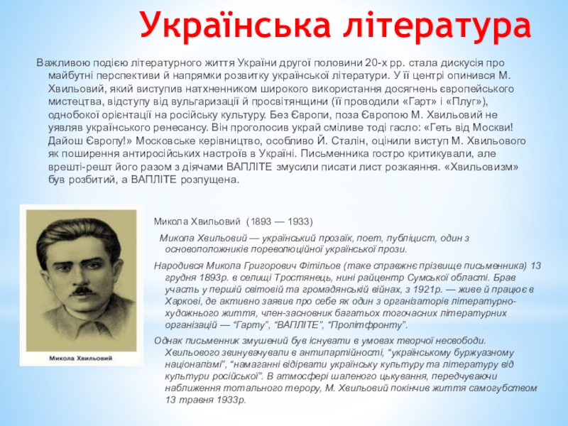 Микола Хвильовий — український прозаїк, поет, публіцист, один з основоположників пореволюційної української прози.