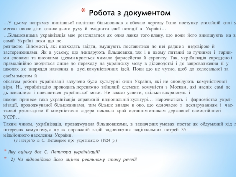 Таким чином, українізація, проваджувана більшовиками, в зазначених умовах постає як обдуманий хід політичної гри в інтересах комунізму, а не як справжній засіб задоволення національних потреб 35-мільйонного населення України. (З інтерв’ю із С. Петлюрою про українізацію (1924 р.)