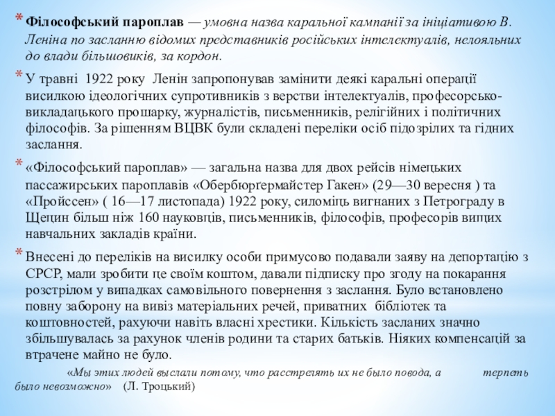 Слайд 18Філософський пароплав — умовна назва каральної кампанії за ініціативою В. Леніна по