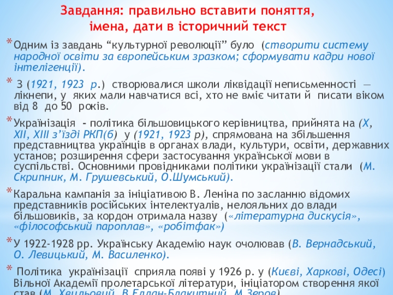 Слайд 21Завдання: правильно вставити поняття, імена, дати в історичний текст