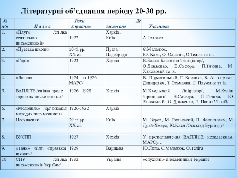 Слайд 20Літературні об’єднання періоду 20-30 рр.