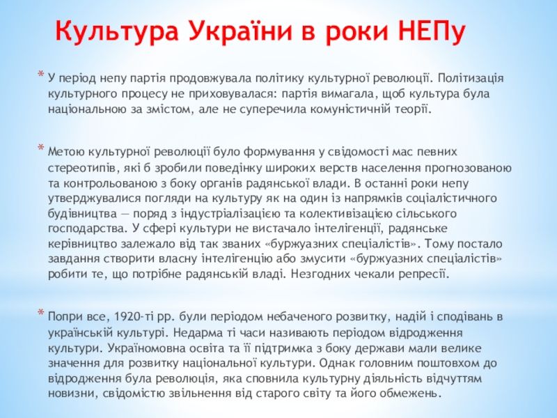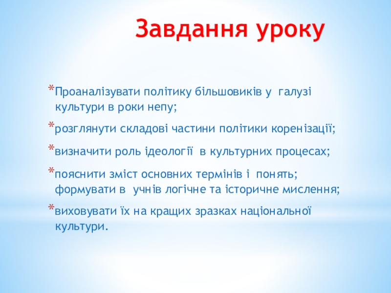 Проаналізувати політику більшовиків у галузі культури в роки непу;