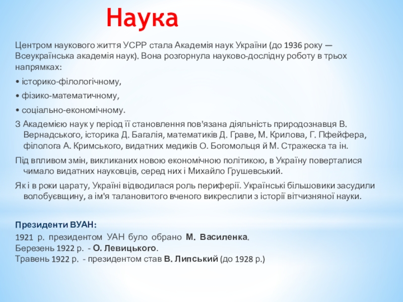 У 1922-1928 рр. Українську Академію наук очолював (В. Вернадський, О. Левицький, М. Василенко).