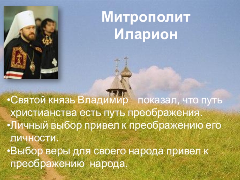 Митрополит Иларион Святой князь Владимир  показал, что путь христианства есть путь преображения.Личный выбор привел к преображению