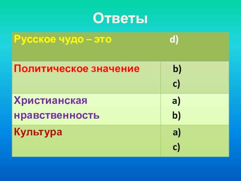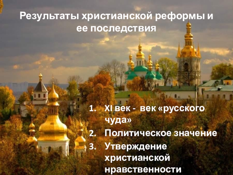 Результаты христианской реформы и ее последствияXI век - век «русского чуда»Политическое значениеУтверждение христианской нравственностиРусская культура