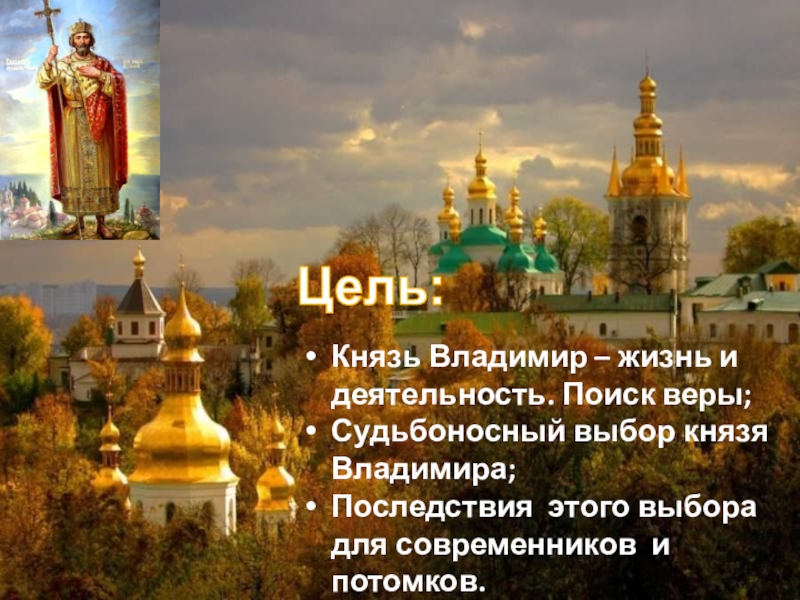 Цель:Князь Владимир – жизнь и деятельность. Поиск веры;Судьбоносный выбор князя Владимира;Последствия этого выбора для современников и потомков.