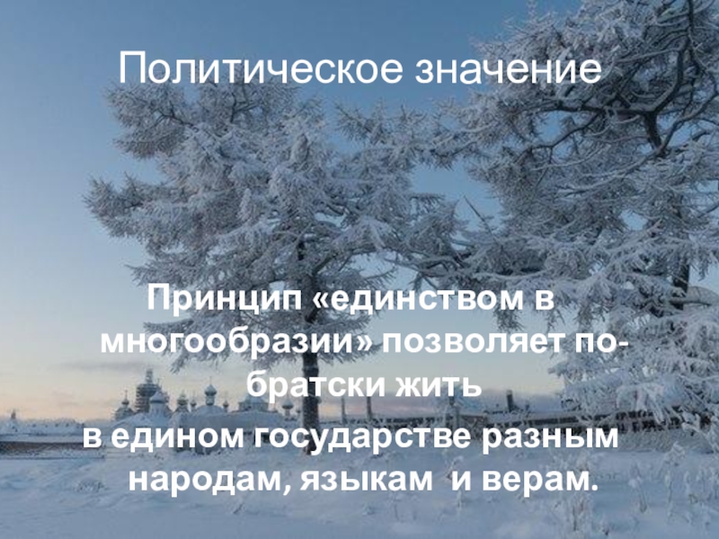 Политическое значение Принцип «единством в многообразии» позволяет по-братски жить в едином государстве разным народам, языкам и верам.