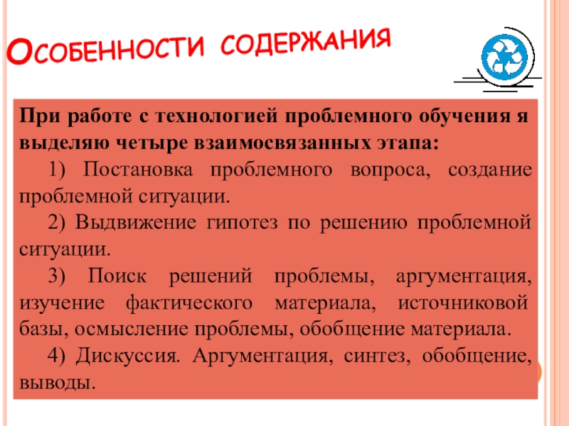 При работе с технологией проблемного обучения я выделяю четыре взаимосвязанных этапа: