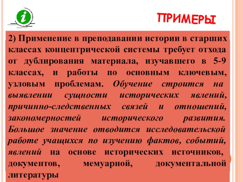 2) Применение в преподавании истории в старших классах концентрической системы требует отхода от дублирования материала, изучавшего в 5-9 классах, и работы по основным ключевым, узловым проблемам. Обучение строится на выявлении сущности исторических явлений, причинно-следственных связей и отношений, закономерностей исторического развития. Большое значение отводится исследовательской работе учащихся по изучению фактов, событий, явлений на основе исторических источников, документов, мемуарной, документальной литературы