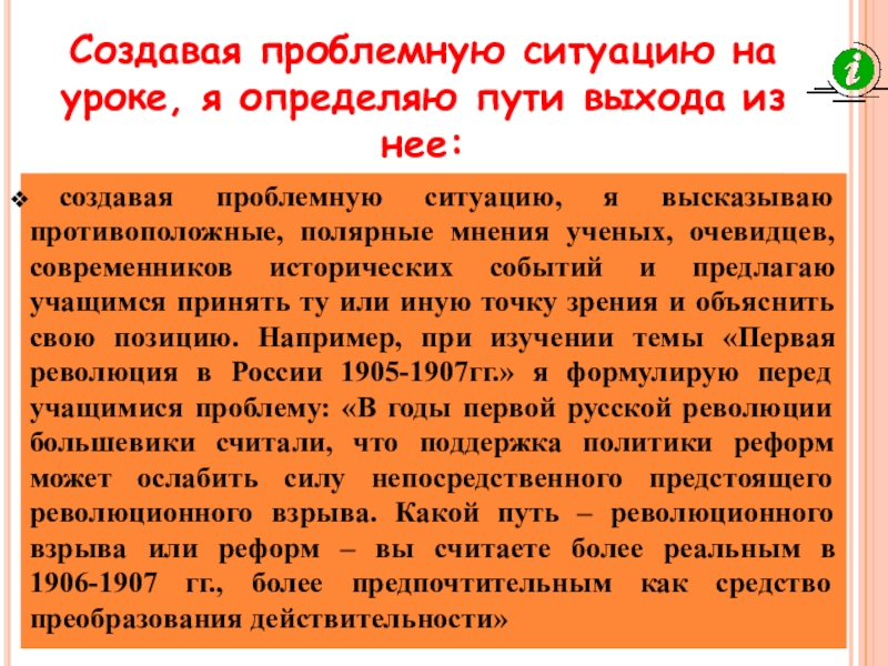 создавая проблемную ситуацию, я высказываю противоположные, полярные мнения ученых, очевидцев, современников исторических событий и предлагаю учащимся принять ту или иную точку зрения и объяснить свою позицию. Например, при изучении темы «Первая революция в России 1905-1907гг.» я формулирую перед учащимися проблему: «В годы первой русской революции большевики считали, что поддержка политики реформ может ослабить силу непосредственного предстоящего революционного взрыва. Какой путь – революционного взрыва или реформ – вы считаете более реальным в 1906-1907 гг., более предпочтительным как средство преобразования действительности»