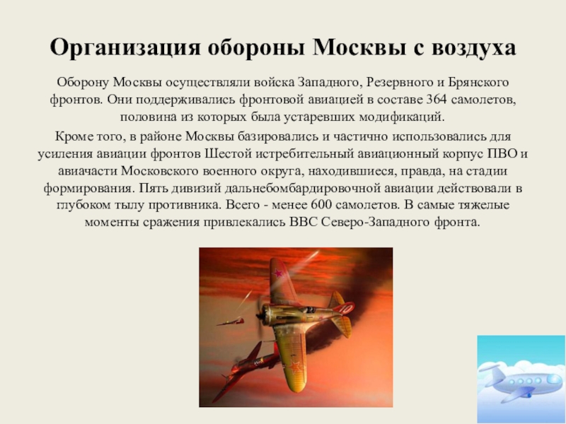 Кроме того, в районе Москвы базировались и частично использовались для усиления авиации фронтов Шестой истребительный авиационный корпус ПВО и авиачасти Московского военного округа, находившиеся, правда, на стадии формирования. Пять дивизий дальнебомбардировочной авиации действовали в глубоком тылу противника. Всего - менее 600 самолетов. В самые тяжелые моменты сражения привлекались ВВС Северо-Западного фронта.