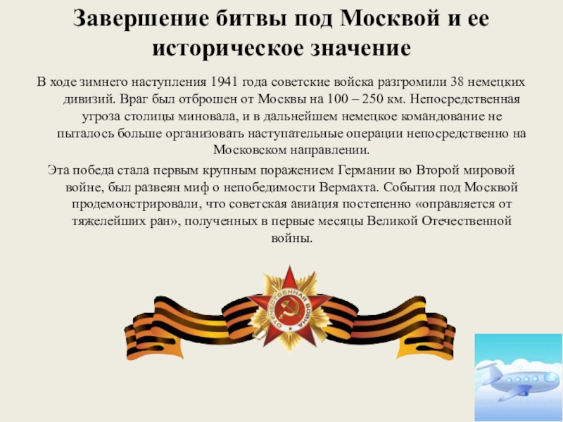 Слайд 13Завершение битвы под Москвой и ее историческое значение
