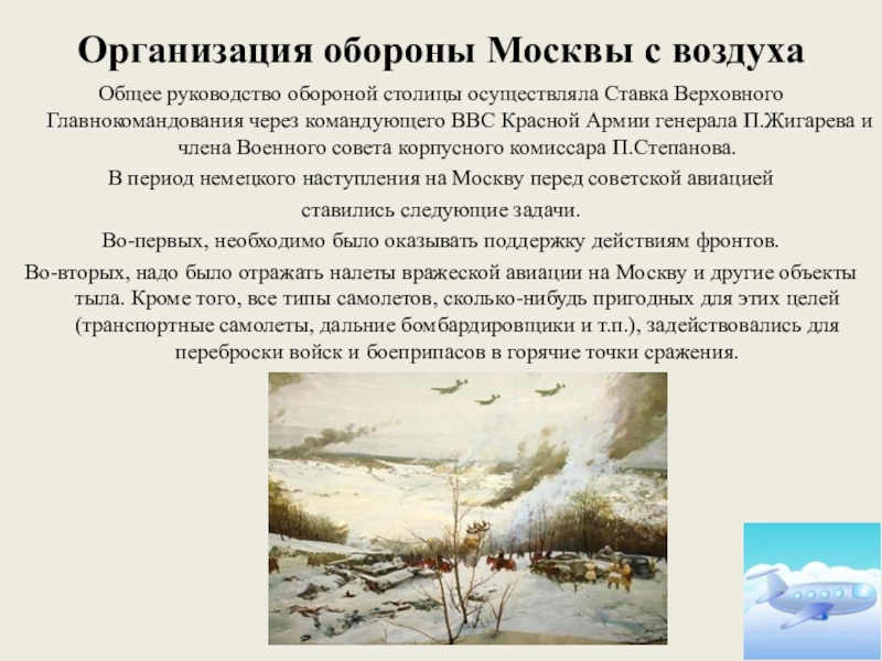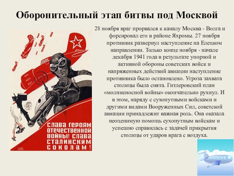 - Волга и форсировал его в районе Яхромы. 27 ноября противник развернул наступление на Елецком направлении. Только конце ноября - начале декабря 1941 года в результате упорной и активной обороны советских войск и напряженных действий авиации наступление противника было остановлено. Угроза захвата столицы была снята. Гитлеровский план «молниеносной войны» окончательно рухнул. И в этом, наряду с сухопутными войсками и другими видами Вооруженных Сил, советской авиации принадлежит важная роль. Она оказала неоценимую помощь сухопутным войскам и успешно справилась с задачей прикрытия столицы от ударов врага с воздуха.
