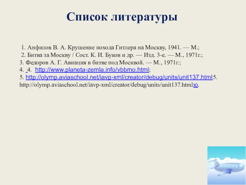 3. Федоров А. Г. Авиация в битве под Москвой. — М., 1971г.;