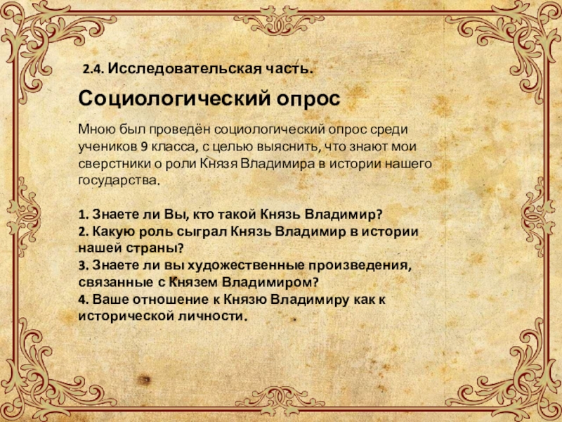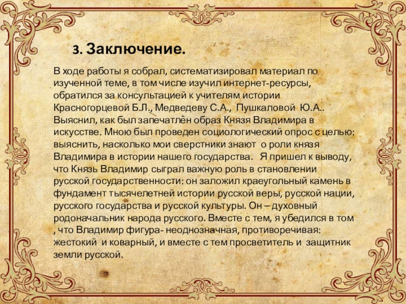 в том числе изучил интернет-ресурсы, обратился за консультацией к учителям истории Красногорцевой Б.Л., Медведеву С.А., Пушкаловой Ю.А.. Выяснил, как был запечатлён образ Князя Владимира в искусстве. Мною был проведен социологический опрос с целью: выяснить, насколько мои сверстники знают о роли князя Владимира в истории нашего государства. Я пришел к выводу, что Князь Владимир сыграл важную роль в становлении русской государственности: он заложил краеугольный камень в фундамент тысячелетней истории русской веры, русской нации, русского государства и русской культуры. Он – духовный родоначальник народа русского. Вместе с тем, я убедился в том , что Владимир фигура- неоднозначная, противоречивая: жестокий и коварный, и вместе с тем просветитель и защитник земли русской.