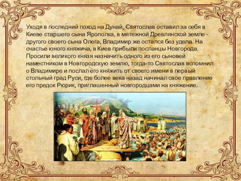 Слайд 8Уходя в последний поход на Дунай, Святослав оставил за себя в