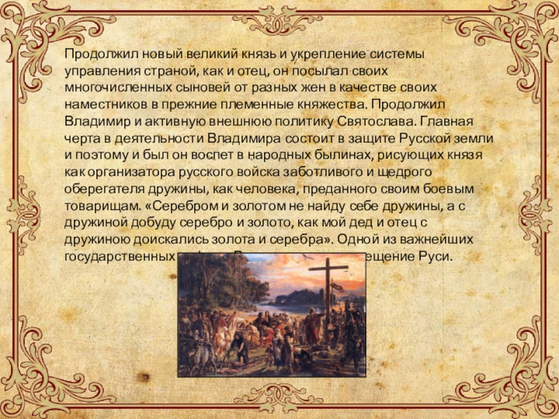 отец, он посылал своих многочисленных сыновей от разных жен в качестве своих наместников в прежние племенные княжества. Продолжил Владимир и активную внешнюю политику Святослава. Главная черта в деятельности Владимира состоит в защите Русской земли и поэтому и был он воспет в народных былинах, рисующих князя как организатора русского войска заботливого и щедрого оберегателя дружины, как человека, преданного своим боевым товарищам. «Серебром и золотом не найду себе дружины, а с дружиной добуду серебро и золото, как мой дед и отец с дружиною доискались золота и серебра». Одной из важнейших государственных реформ Владимира стало крещение Руси.