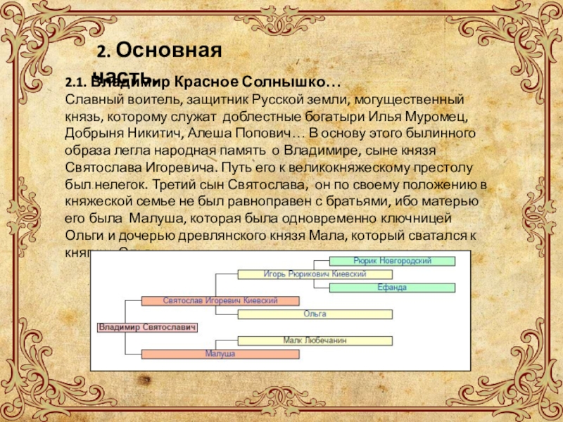 земли, могущественный князь, которому служат доблестные богатыри Илья Муромец, Добрыня Никитич, Алеша Попович… В основу этого былинного образа легла народная память о Владимире, сыне князя Святослава Игоревича. Путь его к великокняжескому престолу был нелегок. Третий сын Святослава, он по своему положению в княжеской семье не был равноправен с братьями, ибо матерью его была Малуша, которая была одновременно ключницей Ольги и дочерью древлянского князя Мала, который сватался к княгине Ольге.