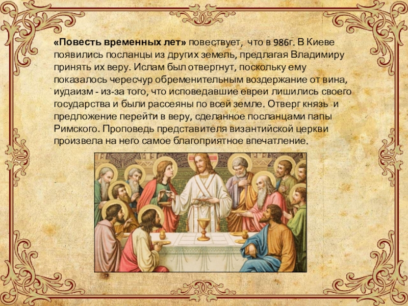 Слайд 13«Повесть временных лет» повествует, что в 986г. В Киеве появились посланцы