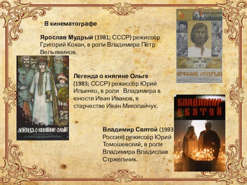 Легенда о княгине Ольге (1983; СССР) режиссёр Юрий Ильенко, в роли Владимира в юности Иван Иванов, в старчестве Иван Миколайчук.