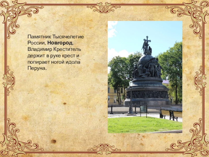 Слайд 24Памятник Тысячелетие России. Новгород. Владимир Креститель держит в руке крест и