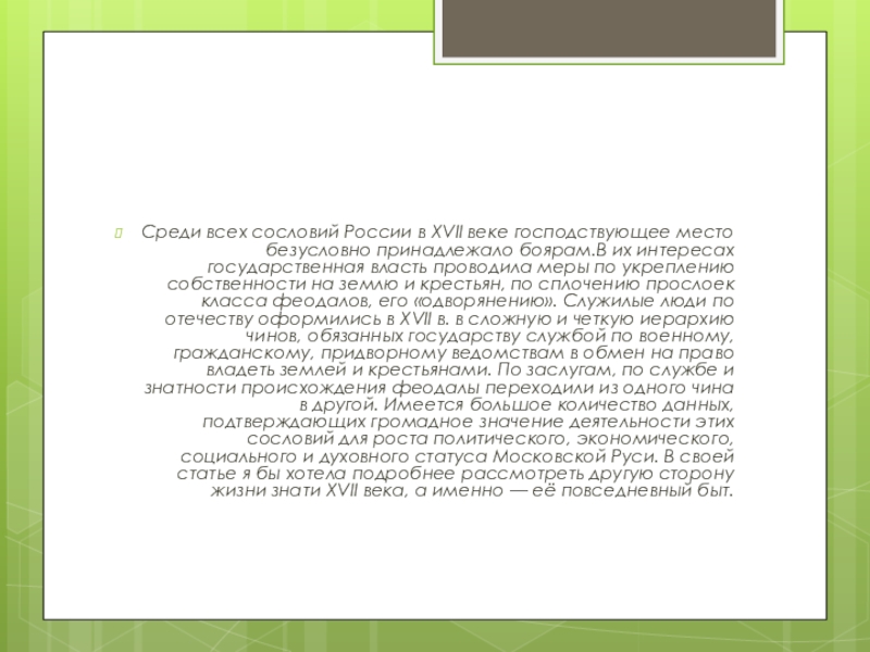 боярам.В их интересах государственная власть проводила меры по укреплению собственности на землю и крестьян, по сплочению прослоек класса феодалов, его «одворянению». Служилые люди по отечеству оформились в XVII в. в сложную и четкую иерархию чинов, обязанных государству службой по военному, гражданскому, придворному ведомствам в обмен на право владеть землей и крестьянами. По заслугам, по службе и знатности происхождения феодалы переходили из одного чина в другой. Имеется большое количество данных, подтверждающих громадное значение деятельности этих сословий для роста политического, экономического, социального и духовного статуса Московской Руси. В своей статье я бы хотела подробнее рассмотреть другую сторону жизни знати XVII века, а именно — её повседневный быт.