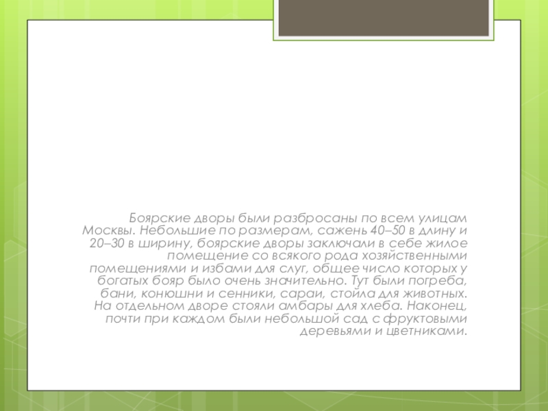 сажень 40–50 в длину и 20–30 в ширину, боярские дворы заключали в себе жилое помещение со всякого рода хозяйственными помещениями и избами для слуг, общее число которых у богатых бояр было очень значительно. Тут были погреба, бани, конюшни и сенники, сараи, стойла для животных. На отдельном дворе стояли амбары для хлеба. Наконец, почти при каждом были небольшой сад с фруктовыми деревьями и цветниками.